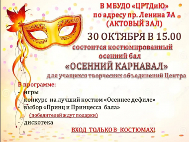 Центр развития творчества детей и юношества с радостью приглашает воспитанников творческих объединений, на наш волшебный Осенний Карнавал!